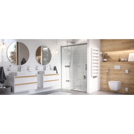 Bateria prysznicowo-wannowa 3-funkcyjna podtynkowa serii Krotos posiada Fix-Box, który ułatwia instalację baterii oraz zapewnia stały dostęp rewizyjny do mechanizmu baterii. Mechaniczny przełącznik funkcji pozwala na wygodny wybór wypływu wody – system Easy-Click pozwala na regulację jednocześnie źródła wody (włącz-wyłącz) oraz ciśnienia przez obrót tego samego pokrętła. Temperaturę można regulować dzięki pokrętle po lewej. Bateria posiada wbudowany uchwyt słuchawki prysznicowej z przyłączem kątowym dla węża prysznicowego.