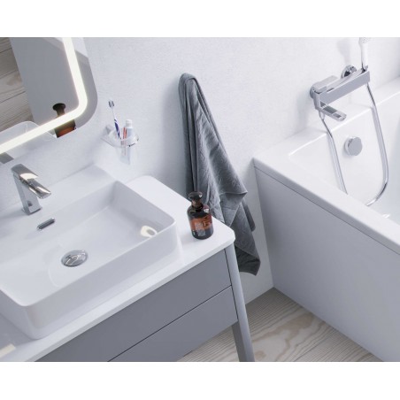 Bateria umywalkowa niska posiada wylewkę o zasięgu 100mm i wysokości 105mm. Dzięki temu z powodzeniem może być stosowana do większości umywalek. Korpus umywalki wykonany jest z jednego odlewu. Posiada głowicę Kerox. Jej idealnym uzupełnieniem będą korki umywalkowo-bidetowe w kolorze chrom lub białym (dopasowanym do koloru ceramiki). Dostępna także kolorze chrom/biel.