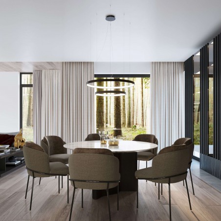 RIO zachwyca wszechstronnością. Żyrandol (pojedynczy podwójny lub potrójny) oraz plafon to jego bardziej klasyczne odsłony. Artystyczną wariacją na temat RIO jest zaś lampa wisząca pionowo, która daje nieskończone możliwości aranżacyjne zarówno w pomieszczeniach prywatnych, takich jak hol, salon, garderoba, łazienka jak i w eleganckich przestrzeniach publicznych typu: centrum odnowy biologicznej, salon SPA, galeria, butik, restauracja, biuro. Oprawy w formie nowoczesnych okręgów ledowych gwarantują wysoką estetykę i znakomite parametry świecenia (3000K CRI 90, 4000K CRI 95) Wysoka ilość lumenów w zintegrowanym źródle światła typu LED). Estetyczny wygląd oprawy zawdzięczają również wymiarom profilu, który wynosi: wysokość 40mm, szerokość 8mm. Ringi w całości produkowane są w Polsce, dzięki czemu gwarantujemy szybki czas realizacji zamówień.